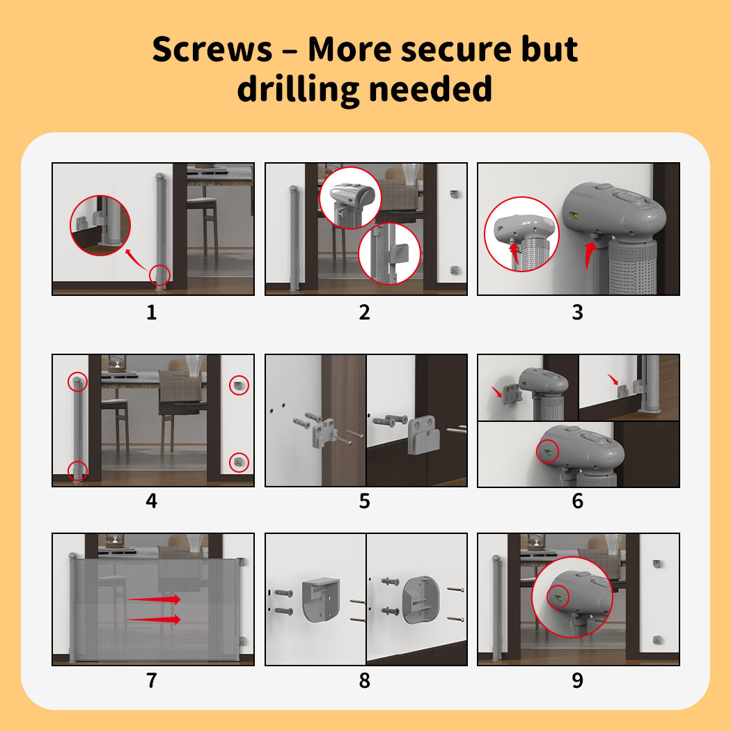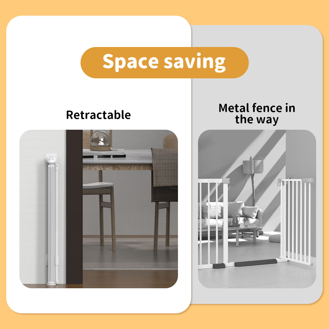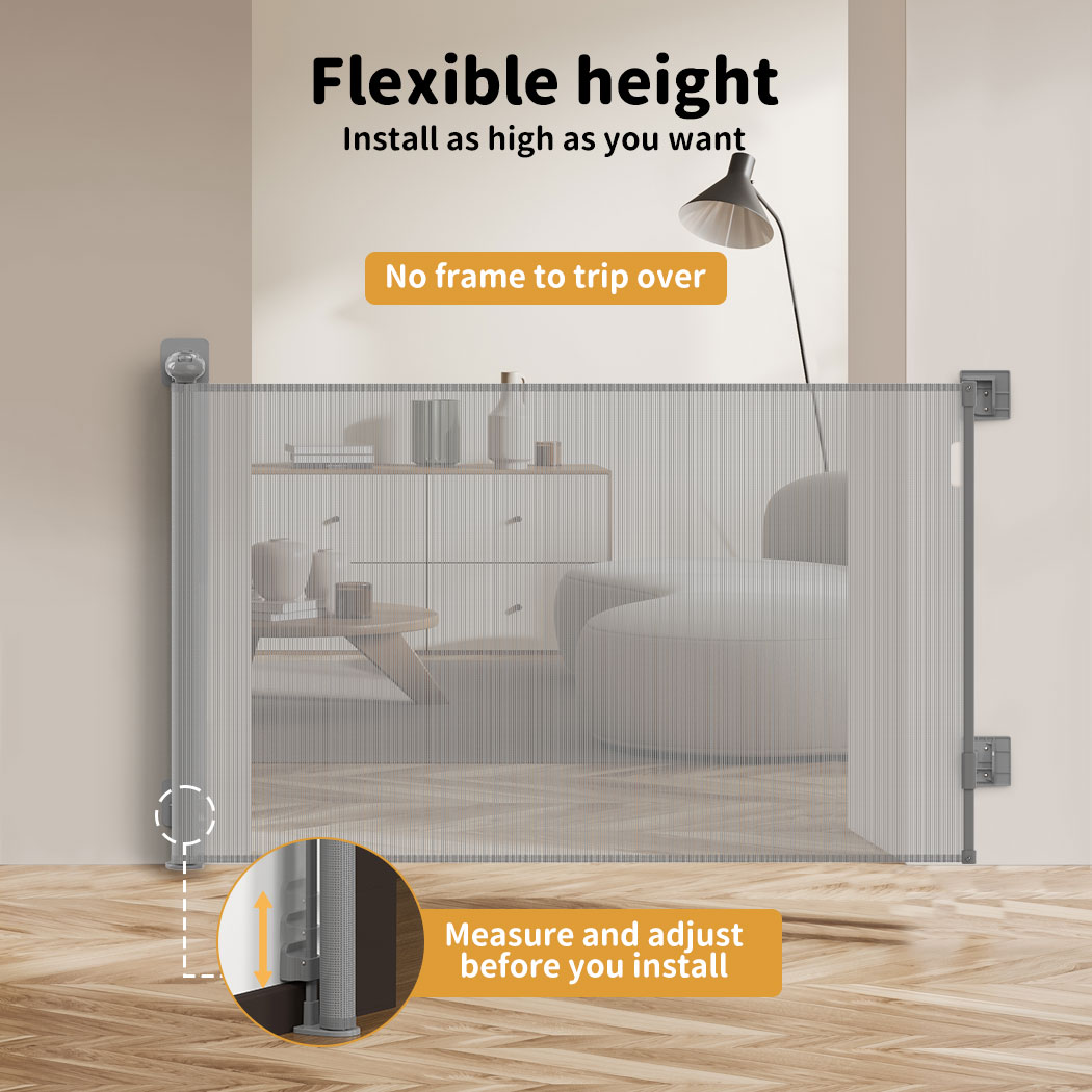 Baby Safety Gates Mesh Retractable Pet Stair Doorways Guard 150/300CM In Stock DESCRIPTION Peace of mind. Your retractable baby gate gives you peace of mind. Pull the gate shut and keep your baby where you want them....