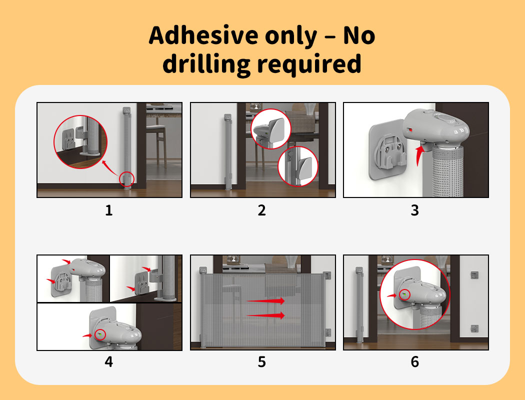 Use adhesive tape or screws to attach your baby safety gate. Follow the instructions and make sure your measure your space first. You need flat wall on both sides of the door to install the gate. Easy to open once installed.