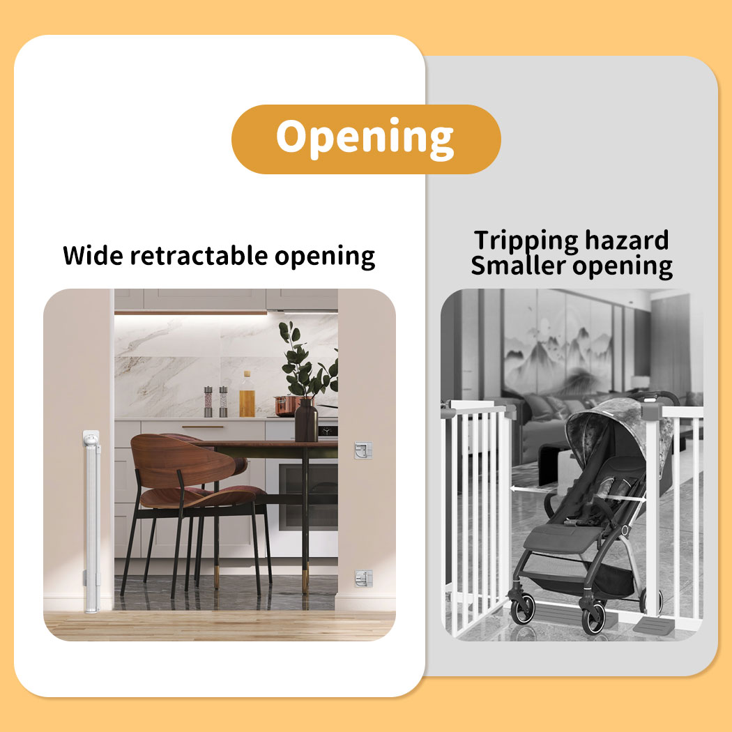 Peace of mind. Your retractable baby gate gives you peace of mind. Pull the gate shut and keep your baby where you want them. Once your baby starts moving, your whole house becomes a potential danger zone. Keep your baby where you want them.