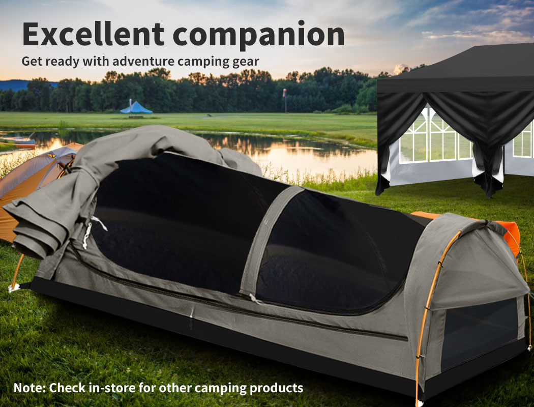 Explore more for outdoor living with our Camping Swag. 400GSM water-repellent rip stop canvas cover, 500gsm PVC flooring and an extra 10cm high edge, it is suitable for each season. Fully enclosed for privacy with zipped openings for fresh air anytime. Mesh panels allow you to have excellent sky vision and keep insects out. High density mattress with 6cm thickness designs for better sleep on any surface. Thick aluminium support poles hold up the entire tent firmly. In addition, you will get inflatable pillows, pegs, guy ropes, carry bag and all the extras that make your camping experience unforgettable.