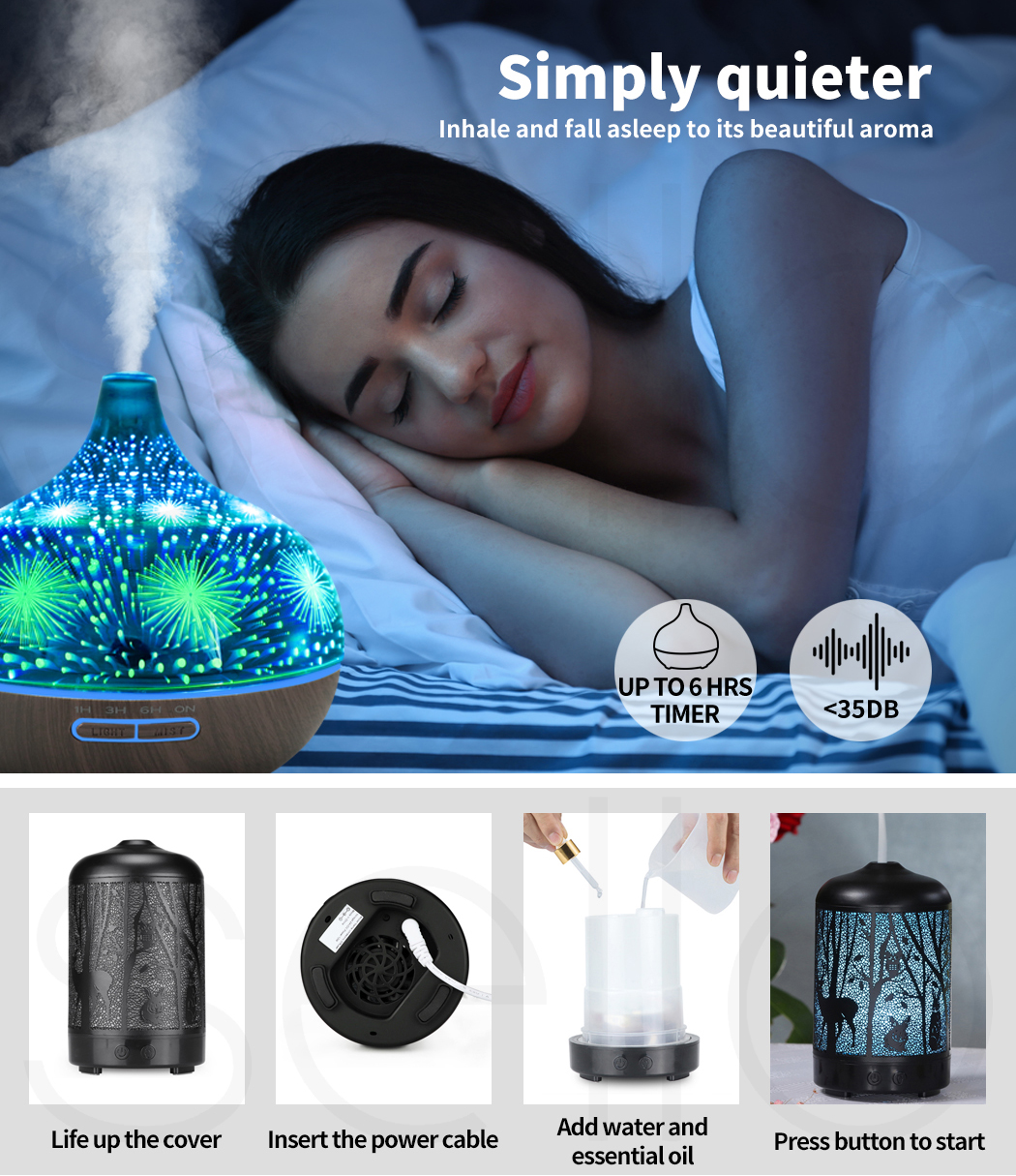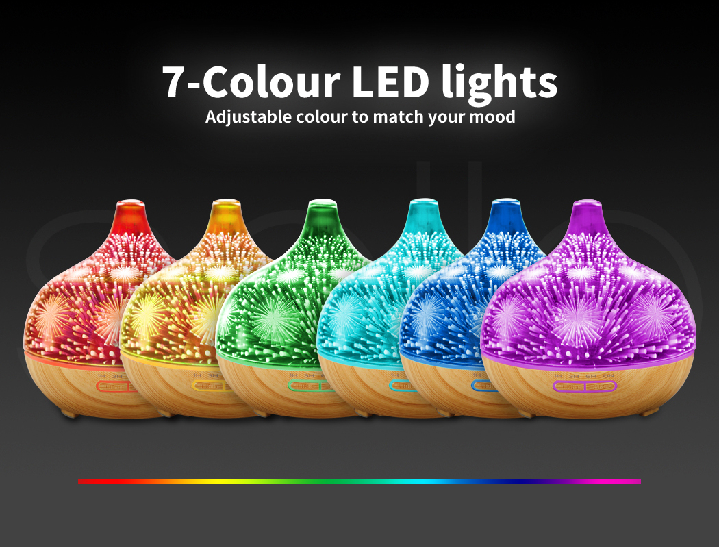 Experience a mesmerizing and soothing phenomenon with our beautifully designed Aroma Diffuser. It emits out aroma so indulging it instantly calms your senses down and takes you into the realm of inner peace. It submerges your surrounding within its grip of sensual fragrance, eliminating stress and healing your inner self. Once turned on it quickly fills your space with beautiful aroma simply sit back, relax, and enjoy. Beneath its wave of wondrous mist vapours, there is a calming sense, a scent so peaceful it simply helps you fall asleep. It is equipped with 7 coloured LED lights to create the unique 3D firework lighting effect. Perfect homely experience, whether you are having alone time or taking a nap or meditating works like a charm for every situation.